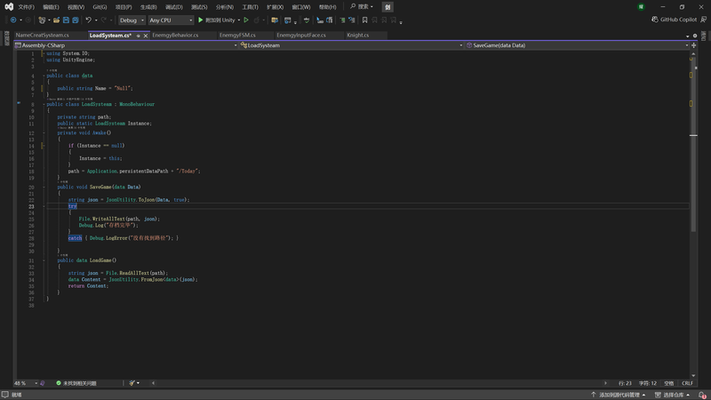 - 敌人AI脚本:基于有限状态机(FSM)设计模式,实现了敌人的行为逻辑。通过 IState 接口定义了 OnEnter 、 OnUpdate 、 OnExit 三个核心方法,将敌人的待机、巡逻、追击、攻击等行为封装成独立的状态类,使代码结构清晰、易于扩展。同时,通过 Parameter 类配置了敌人的移动速度、追击范围等参数,方便美术和策划进行快速调整。