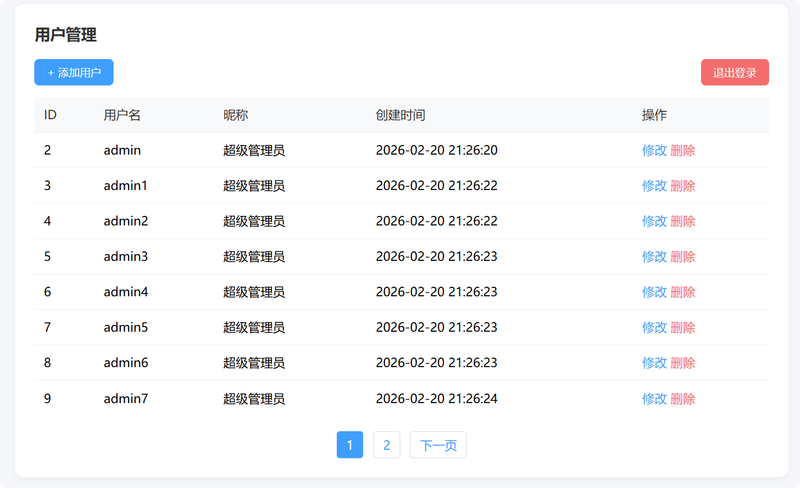本系统基于 PHP+HTML5 开发,实现管理员账户登录验证。后台支持管理员信息的综合管理,包含用户列表展示、新增用户录入、现有用户信息编辑与修改等核心功能,满足基础后台管理需求。