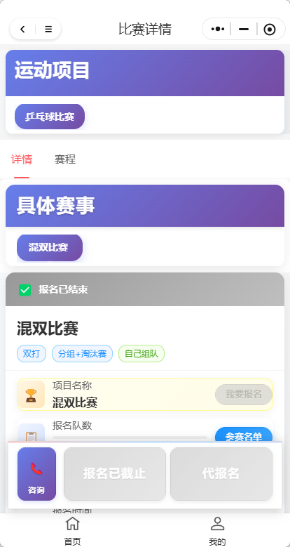1、项目背景:小区、公司等集体,需要组织体育活动时,经常需要人力发布通知并统计参加的人数,再通过电话、社交软件或者线下方式预约场馆和活动时间,若是活动为比赛形式时,还需要手工分组、记录比分、计算积分等繁琐工作,需要耗费较大的人力资源成本。
