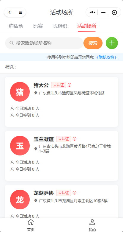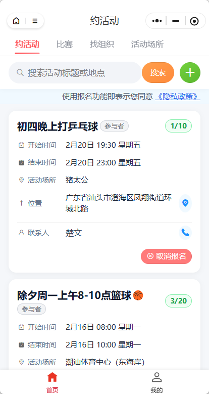 项目主要功能:1、活动:可以查找发布的活动信息,并申请加入。2、组织:查找发布的组织并申请加入;成功加入后,可以参加组织内部发起的活动和赛事。3、比赛:查找发布的比赛并申请加入。4、场所:可以查看场所的空闲情况和预约情况,也可以在线进行场所预约。