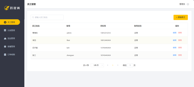 员工管理模块:实现员工信息的增删改查、角色分配与权限控制,确保不同岗位员工拥有对应操作权限。