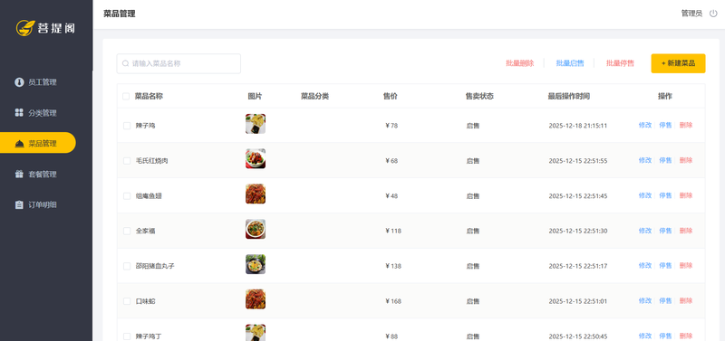 菜品与套餐管理模块:支持菜品分类、菜品信息维护、套餐组合设置及上下架操作,方便商家灵活调整菜单。