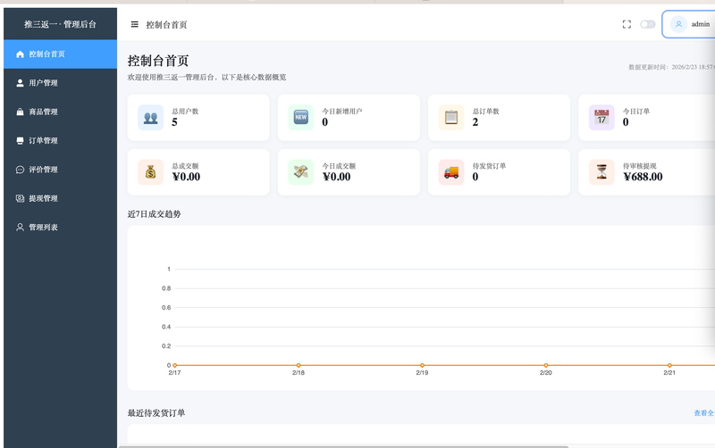 7. 数据统计:展示用户增长、订单金额、返利总额、提现统计等运营数据。