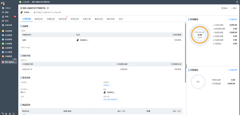 其核心功能模块包括客户关系管理(CRM)、库存管理、项目管理、工单管理、人事管理(eHR)和财务管理,旨在实现销售、仓储与业财一体化,帮助企业降本增效。