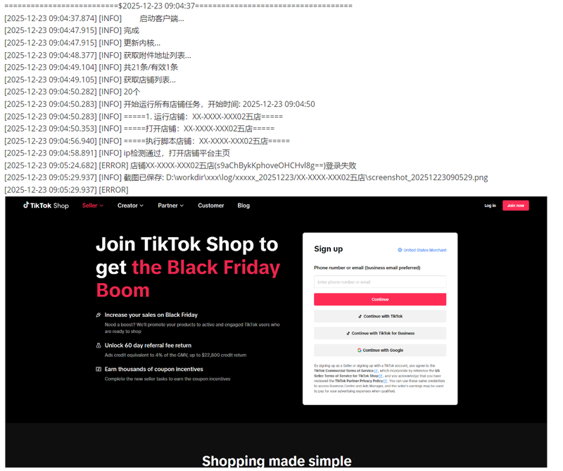 本工具基于指纹浏览器二次开发,深度适配TikTok店铺后台操作逻辑,模拟人工店长操作,核心实现“异常监控、批量运维、数据统计、合规保障”四大核心功能,覆盖店铺日常运维全流程,实现自动化操作与平台合规对接,所有功能支持自定义配置,不同服务器上运行指定功能或指定的店铺。