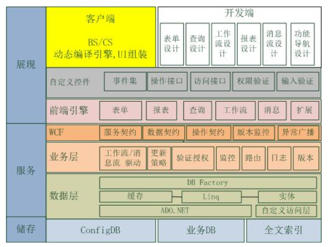 展现:分为客户端和开发端,客户端负责与终端用户进行交互,开发端负责对客户端功能组装,配置,业务逻辑实现。