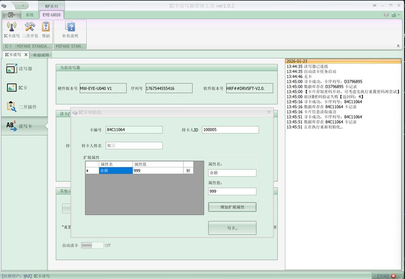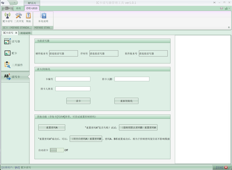 系统主要功能是对IC卡读写器及IC卡的管理和读写测试,以方便拥有一定数量读写器和IC卡片的用户进行科学管理和合理分配之用;目前系统仅对以下系列读写器和卡片进行针对性开发,并完成支持。