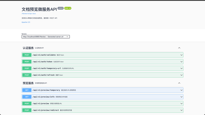 本项目是一个文档预览微服务,主要包含以下功能模块:一、文档在线预览模块,对接kkFileView引擎,支持Word、Excel、PPT、PDF、图片等多种格式的浏览器端在线预览,提供预览URL生成和页面重定向两种接入方式;二、文档格式转换模块,支持Office文档到PDF的同步和异步转换,提供任务状态查询和取消能力;三、安全认证模块,基于JWT实现接口鉴权,同时支持生成带签名和过期时间的临时预览URL,方便外部系统免登录调用;四、水印防泄漏模块,支持在预览文档上动态叠加自定义水印文字;五、二级缓存模块,采用Caffeine本地缓存加Redis分布式缓存,按文件大小智能分级存储,提升预览响应速度;六、限流与审计模块,基于Redis滑动窗口实现接口限流,同时记录所有预览操作的审计日志,支持分页查询和统计分析。