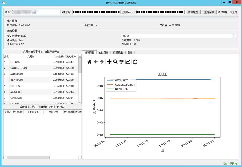 波动率实时排序 + 表格单击一键开仓;价格达阈值自动多/空加仓(单边最多 9 次),满足利润或加仓上限自动平仓;单窗口集成配置、排名、持仓、图表、历史、日志,表格用颜色区分盈亏和订单状态,CSV 记录每笔交易,可选邮件通知。