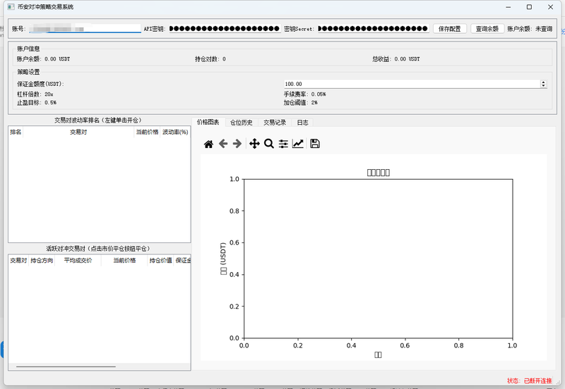 WebSocket 行情、对冲线程根据价格加仓(多/空各最多 9 次)、连接状态显示。