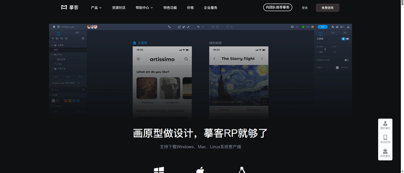 摹客 RP 是云端在线原型设计工具,支持快速制作低保真与高保真原型,拥有丰富组件库与页面交互效果,支持团队在线评审、版本管理,可自动生成标注与切图,高效衔接产品、设计与开发,适配多终端产品原型制作与协作。