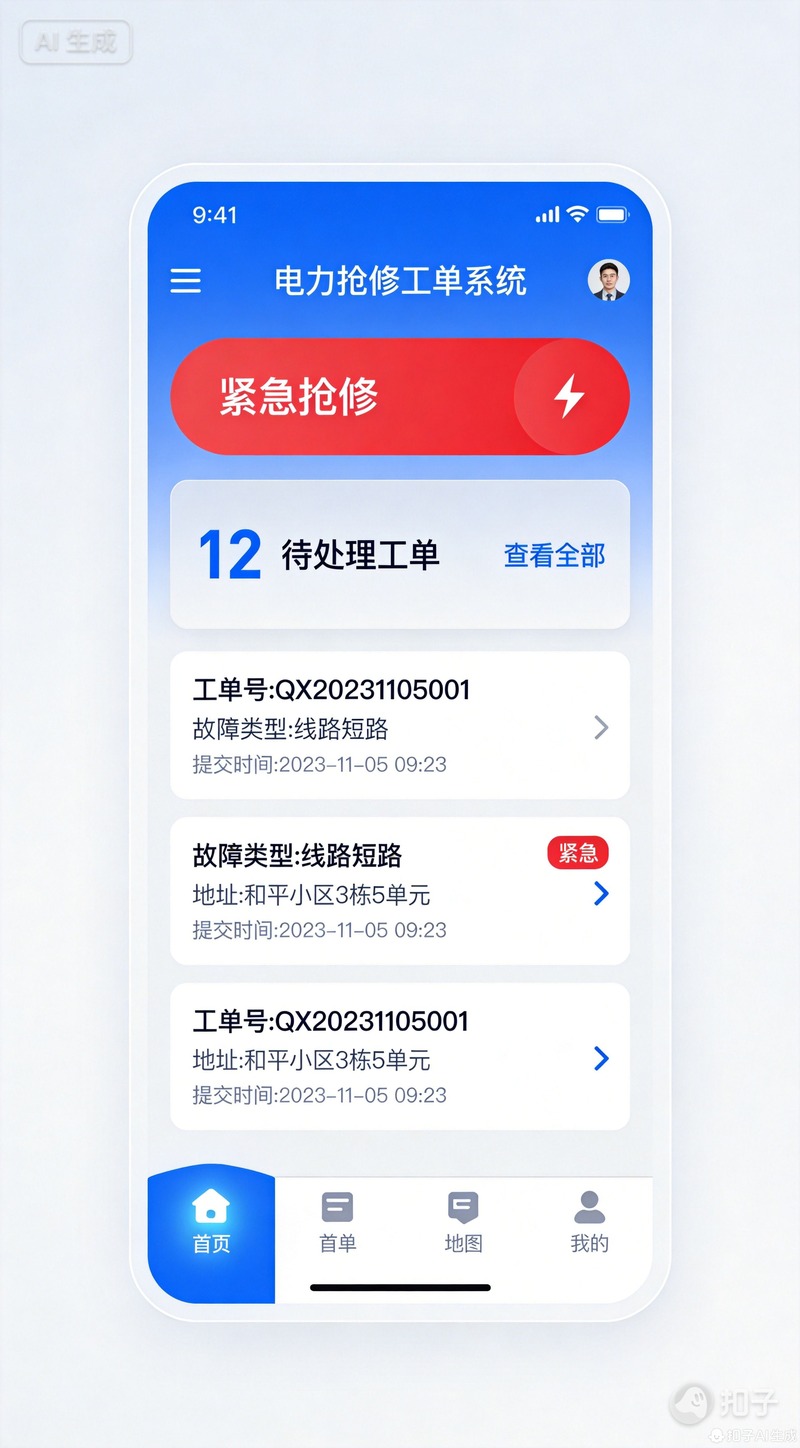 1、主要以电力用户报修和工程抢修为主线而研发的一款工单系统APP,分为电力用户端:以发起报修工单、电费缴费为主,电工端:以智能抢单/派单为主。系统模块包含工单运营、地图引擎、消息轮询、派单引擎、账号系统等,使用环境包括APP端(Android /iOS)、PC端(web)。