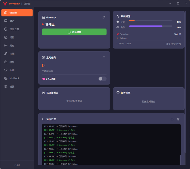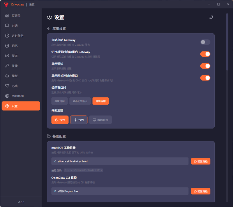 Driveclaw 是 moltBOT/OpenClaw 的桌面控制面板,提供可视化界面来管理和监控你的 AI 助手。