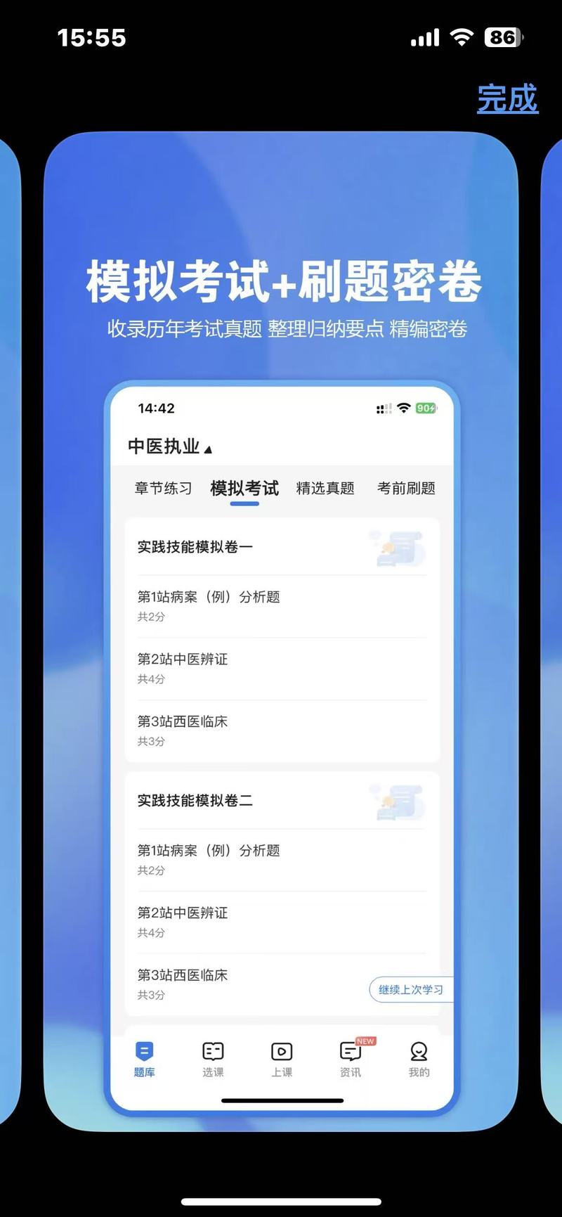 高质量试题,覆盖相关科目大纲所有章节考点。智能题库包含:单选题、多选题、案例分析题、配伍题、不定项选择题、共用题干等不同类型的题目,支持反复练习的需求。