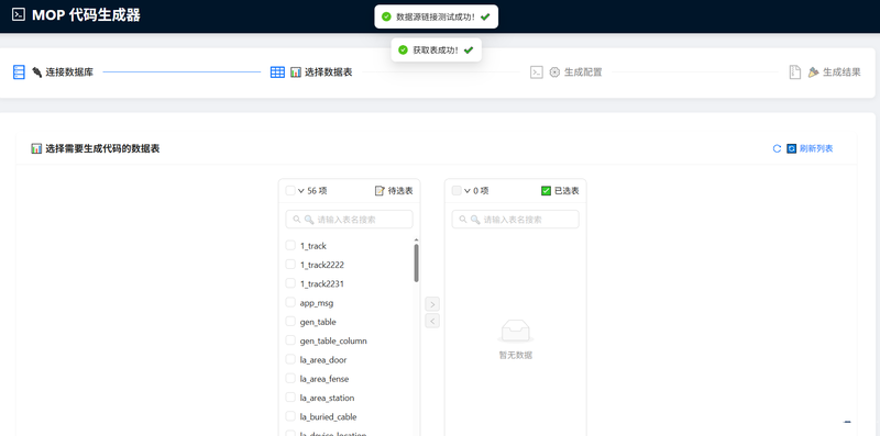 表选择: 穿梭框多选数据表,支持模糊搜索。