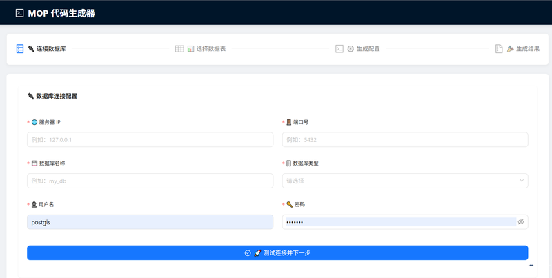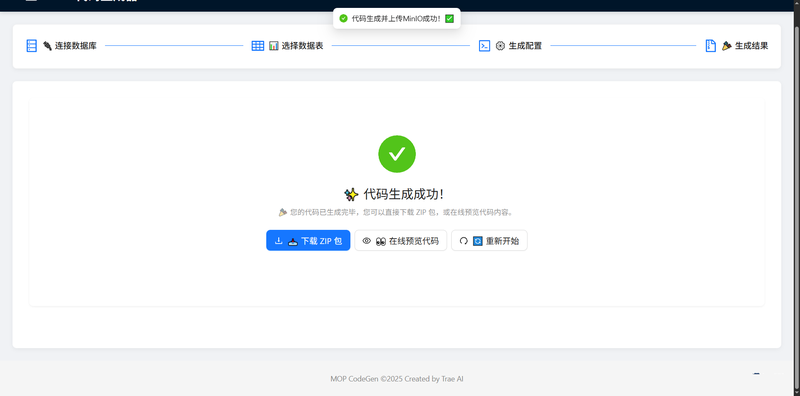 MOP CodeGen 是一个功能强大的全栈代码生成平台,旨在为开发者提供一站式的代码生成解决方案。本项目采用前后端分离开发,最终合并部署的架构。前端基于 React + Vite + TypeScript 构建现代化交互界面,后端基于 Spring Boot + MyBatis Plus 提供强大的代码生成引擎与多数据库支持。