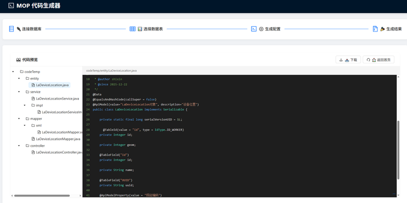 预览下载: 实时预览 Java 代码(高亮显示),支持 ZIP 打包下载。