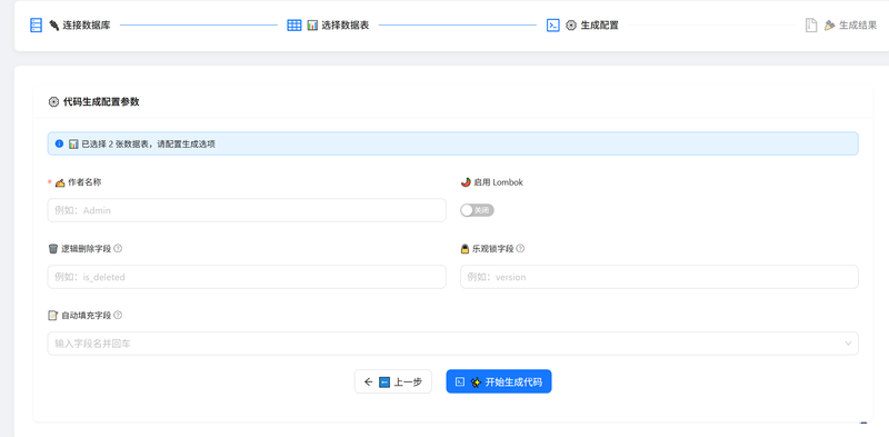 生成配置: 自定义作者、Lombok、逻辑删除、乐观锁及自动填充字段。