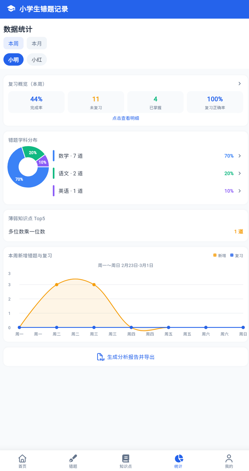 - 自动归纳易错知识点,生成分析报告,直观展示孩子的薄弱环节;