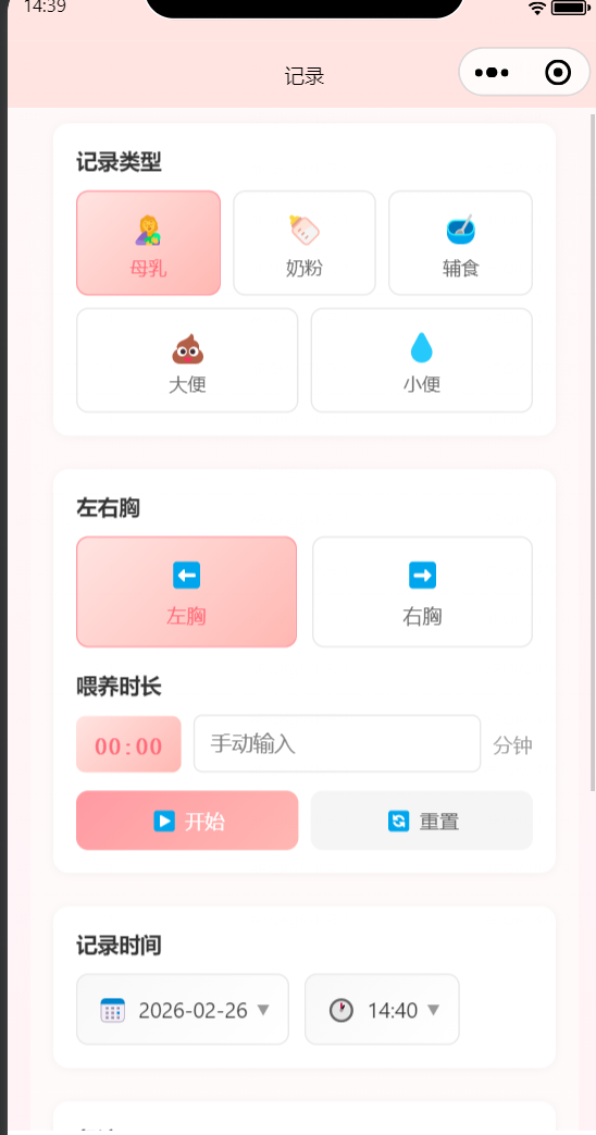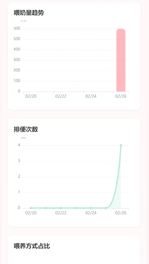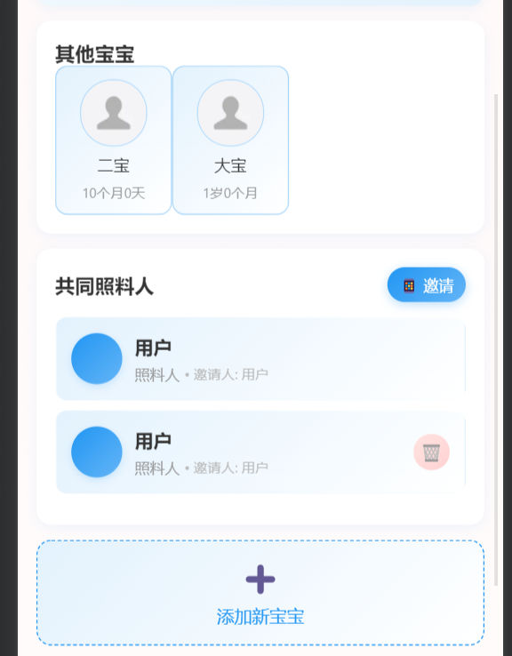 婴幼儿日常照料,记录婴幼儿的喂养,排便,辅食,大小便以及补剂,设立共同照料人,多人信息共享