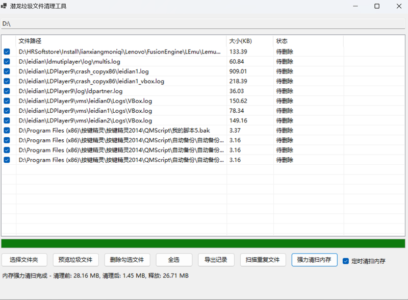潜龙垃圾清理程序是一款轻量高效的系统优化工具,核心聚焦垃圾文件清理与内存释放两大核心功能。可智能扫描并清理系统缓存、无效日志、临时文件等各类冗余垃圾,同时一键释放被占用的内存资源,有效解决系统卡顿、存储空间不足等问题,帮助用户快速优化设备运行状态。并创新地提出“定时内存清理”,保持电脑运行快速的可持续性。