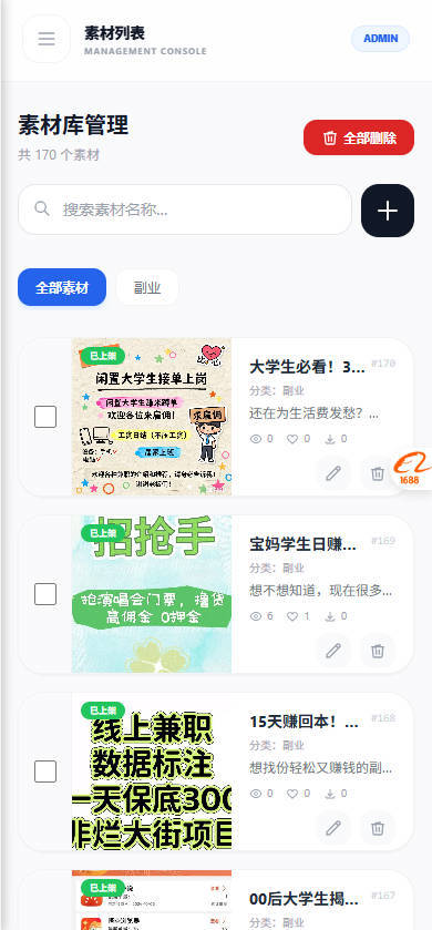 素材管理系统:管理员可以像在电脑整理文件夹一样,批量上传成百上千份素材,支持自动识别图片和文案。