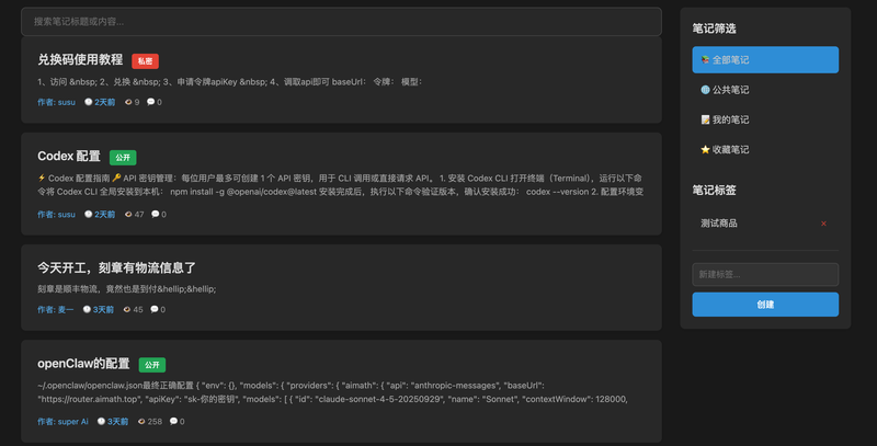 笔记管理模块:支持富文本编辑器(CKEditor)创建和编辑笔记,支持图片上传、代码高亮、标签分类、文章置顶、公开/私密控制、收藏功能,以及基于标题和内容的全文搜索。