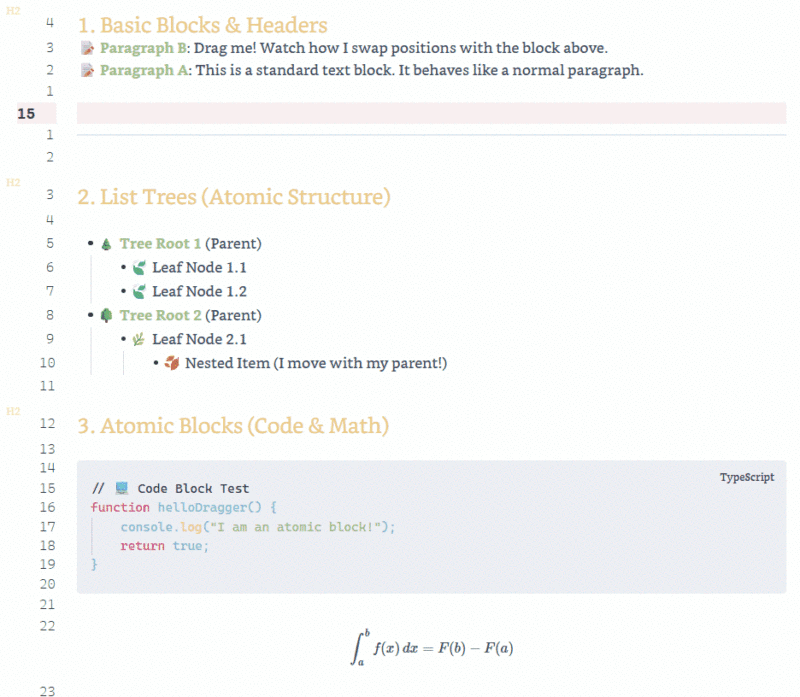 传统的 Markdown 编辑是基于“字符”和“行”的。Dragger 通过底层劫持与空间映射,赋予了每一段文字物理实体感。它让用户意识到,笔记不再是一张死板的纸,而是一组动态的思维模块。这种从“编辑文本”到“操纵结构”的转变,是认知效率的一次飞跃。