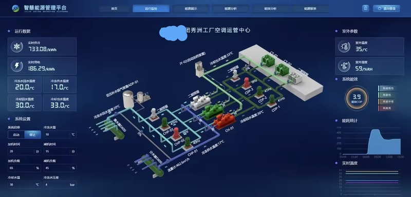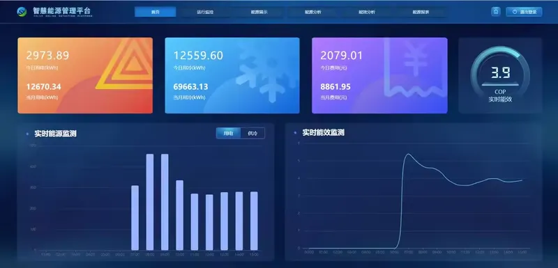 功能主要分为:首页、运行优化控制、能源展示、能源分析、能效分析以及能源报表。