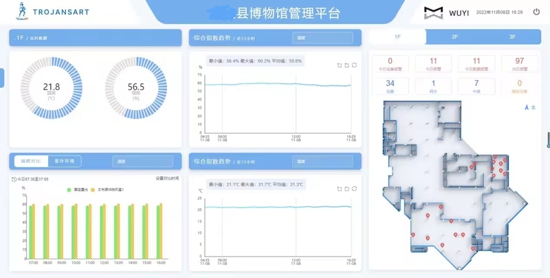 博物馆空气质量管理平台平台主要功能包括:设备实时数据监控;借助于BS开放式软件平台架构,能够满足多个设备的集中监管,帮助用户全方位获取设备的数据信息,有效提升设备的维护效率。