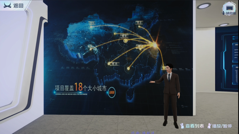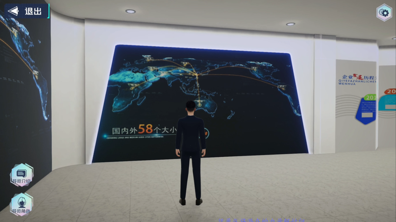 展厅可通过体感(原地踏步, 左右旋转), 键盘(ASD)操控数字人在展厅中行动, 展示屏配置了讲解人, 根据用户配置信息对展厅内容进行语音播报讲解