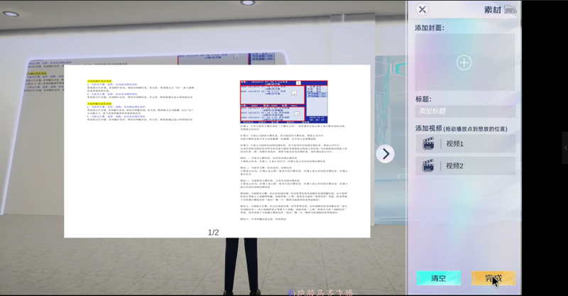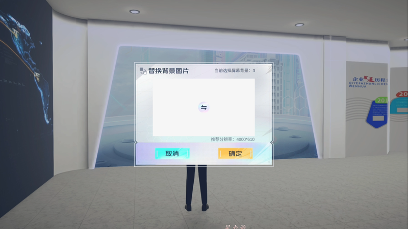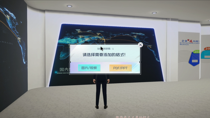 2. 展示模式: 自由模式:用户控制数字人行走到屏幕交互区域, 弹窗出现ui内容, 对配置内容进行展示, 播放图片/视频/ppt, 用户根据对应内容进行播放/暂停/翻页等ui操作; 自动导览:有讲解员对屏幕内容进行讲解, 从第一块屏开始, 讲解员从左/右步入镜头内, 语音播报配置的说明内容, 播报完毕后镜头切换, 展示下一个屏幕内容, 直到展示完毕