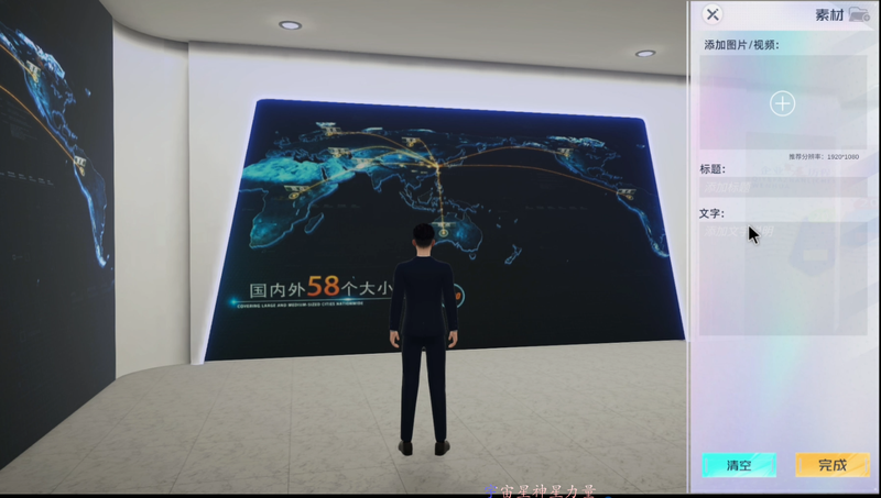 1.编辑模式:可为展厅的展示屏以及墙体内容进行配置, 包括: 图片, 视频, ppt等, 同时可配置说明内容, 说明内容将在展示模式由讲解人进行语音播报