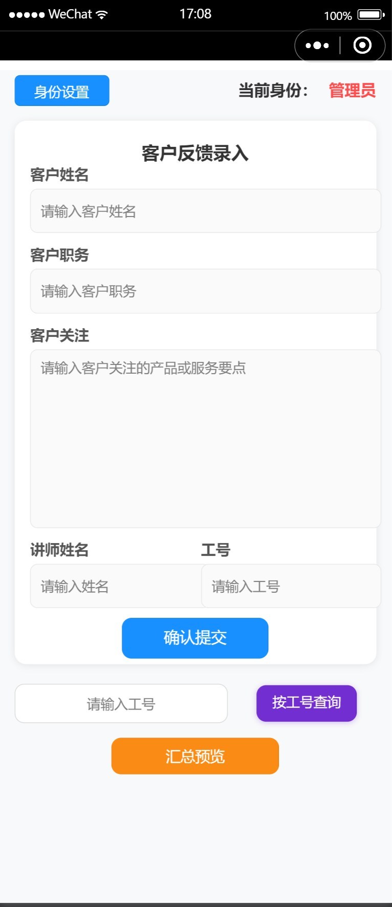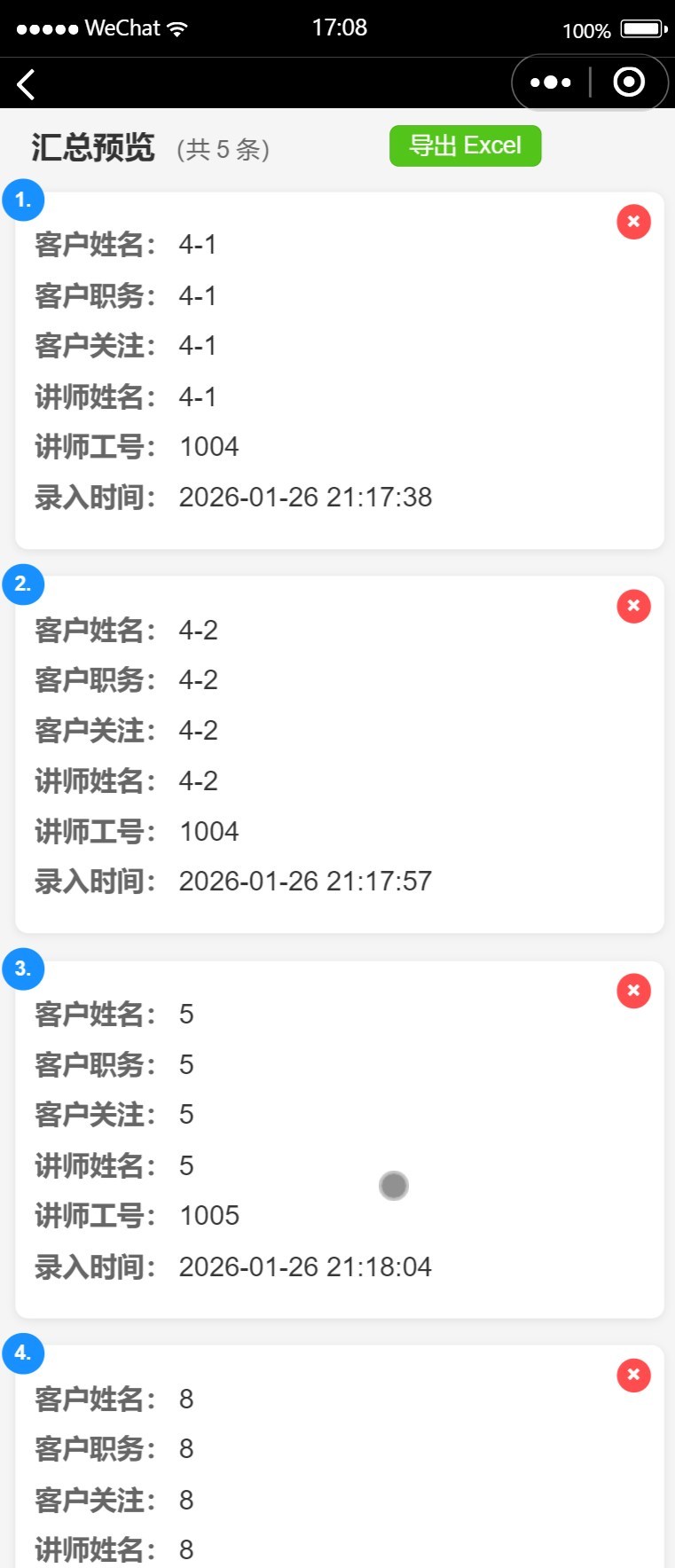 企业展会接待客户,讲师可通过小程序录入客户的声音,管理员可将汇总的客户声音以Excel方式导出。