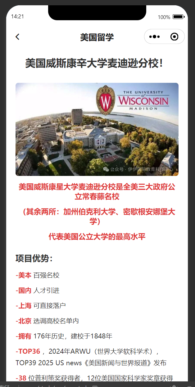 信/扫码);⑤资讯页面,展示海外规划相关最新动态;⑥院校搜索功能,支持按需检索目标院校。
