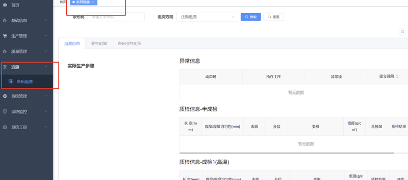 WEB页面:基础信息、质量管理、追溯管理、生产管理