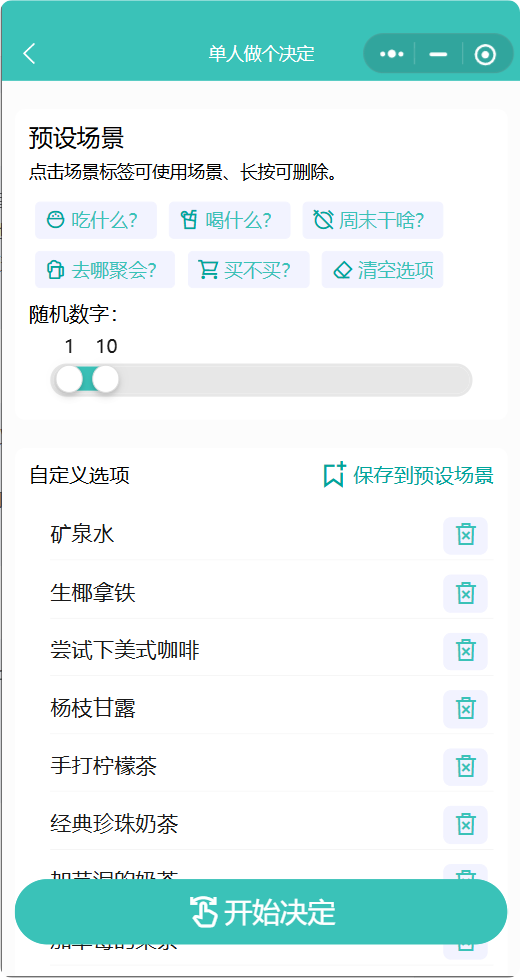 1.单人做个决定:提供丰富的预设决策场景,例如:“今天吃什么”“周末去哪玩”等用户可直接调用,同时支持用户自定义场景。用户调用场景后系统将随机抽出结果。