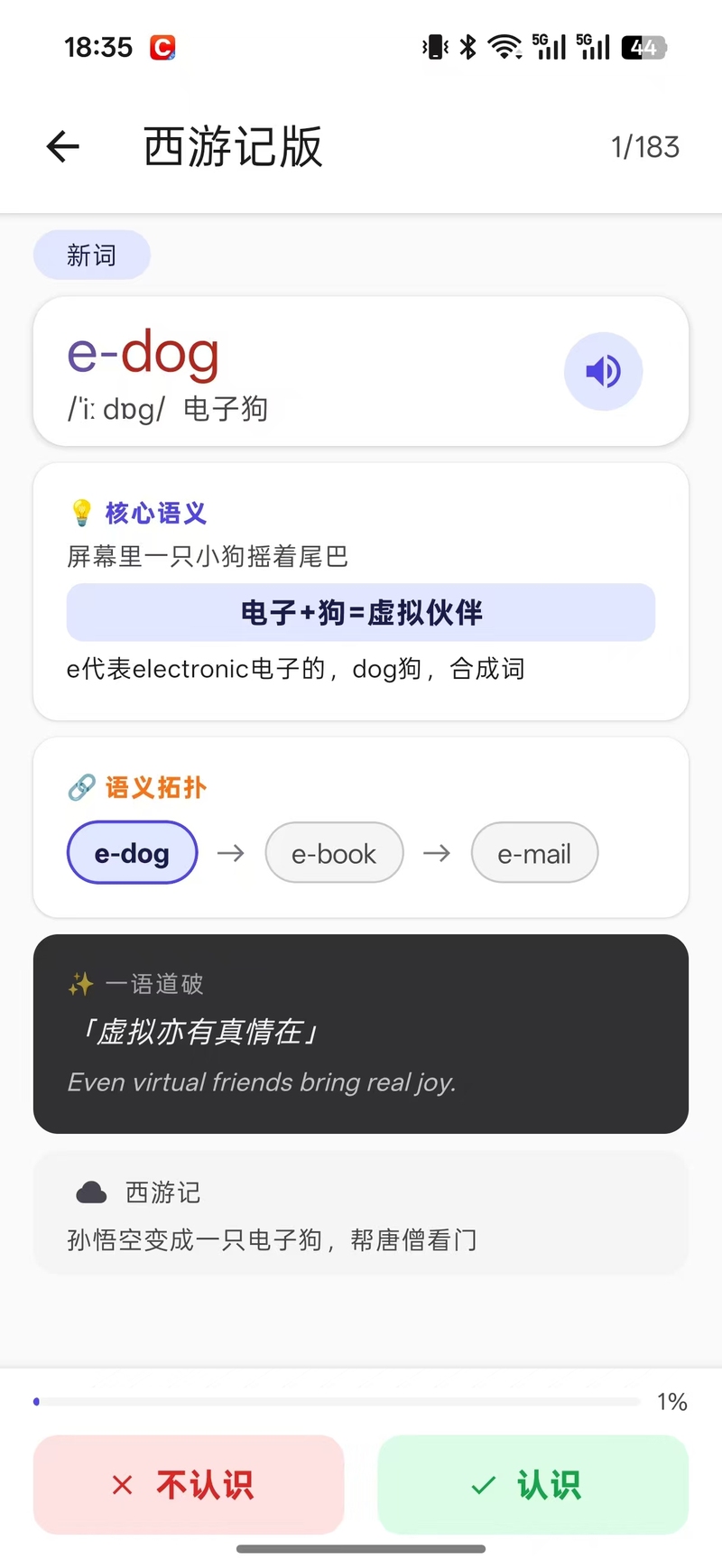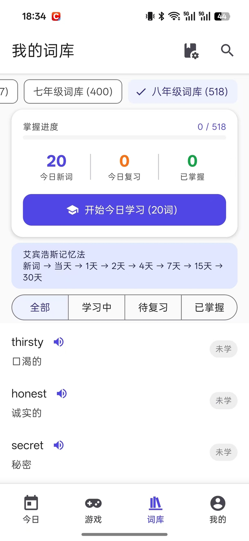 2. 智能复习系统:基于艾宾浩斯遗忘曲线算法,自动计算每个单词的最佳复习时间点,推送复习提醒,确保长期记忆效果。