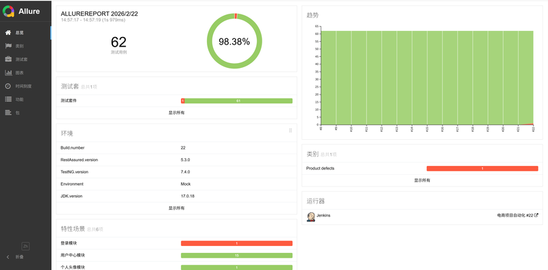 自主设计并实现了一套基于 Java + TestNG + RestAssured 的数据驱动接口自动化测试框架,覆盖 60+ 接口用例,并集成 Allure 报告与 Jenkins CI/CD。