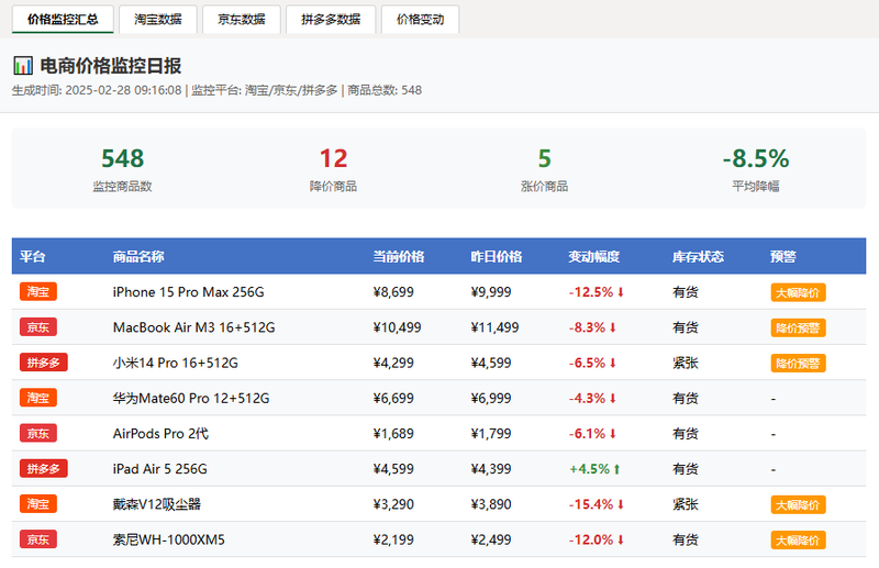 3. 价格预警系统:智能比对历史价格,当商品价格降幅超过设定阈值(如10%)时,自动发送邮件提醒运营人员。