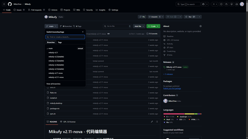 后端基于 C++23 开发,采用 GTK4 构建桌面界面,集成 WebKitGTK 6.0 作为 Web 渲染引擎。内置自研 HTTP/1.1 服务器(基于 poll 的非阻塞 I/O),使用 nlohmann/json 进行 JSON 处理,libmagic 进行文件类型检测。文本编辑核心采用 Piece Table 架构,支持 mmap 映射与 O(log n) 插入删除。终端系统基于 PTY + epoll 实现事件驱动与多进程管理,支持 forkpty + execve,并具备 X11/Wayland GUI 检测能力。