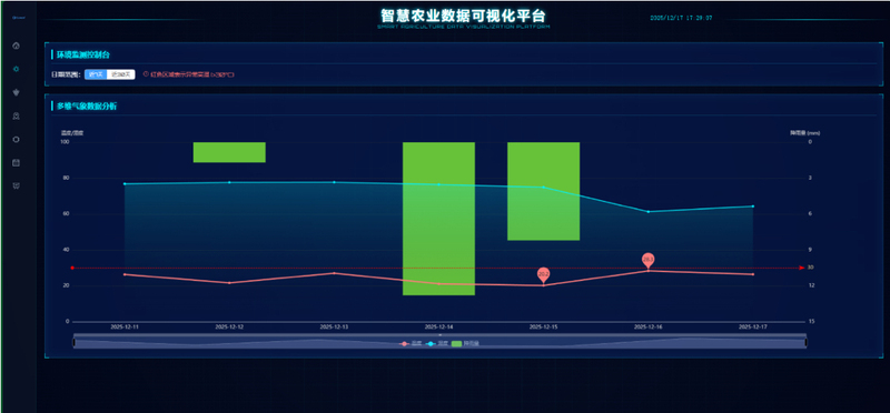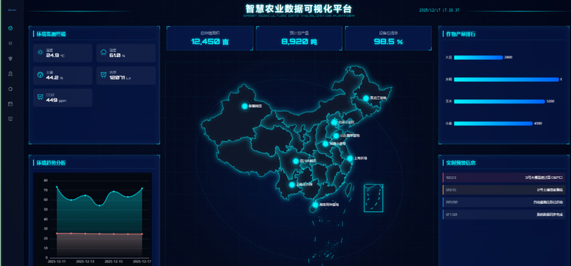 系统通过部署在田间的传感器、摄像头和物联网设备,24小时采集土壤墒情、气象环境、虫情病害等关键数据,实时呈现在可视化大屏上。管理人员可远程查看苗情长势,系统具备阈值预警功能——当温湿度异常或虫害超标时自动推送告警信息至手机端。平台集成农事记录、投入品管理、质量溯源等功能,实现从播种到收获的全流程数字化监管。