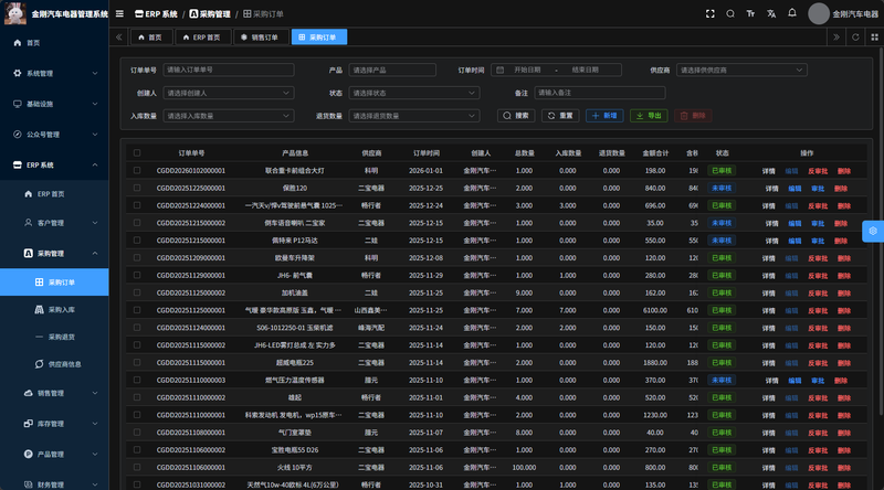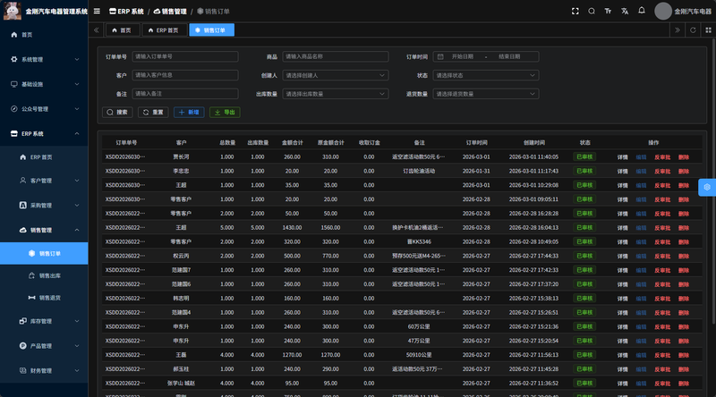 核心能力:数据联动(订单 - 出入库 - 库存 - 财务)、权限控制、数据统计查询。
