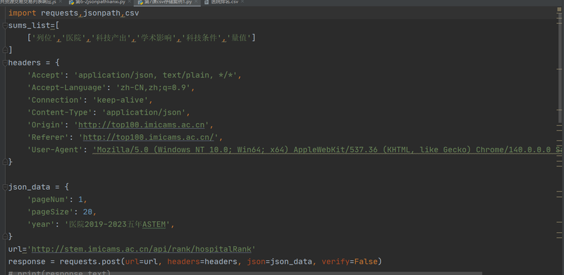 根据客户要求获取全国医院实力排名数据,其中包括排列名次,医院名称,科技产出,学术影响,科技条件,总量值。利用python请求方法获取全部数据,再用for循环方法依次获取医院各项分类数据,并将数据整合为一个csv(表格文件)。