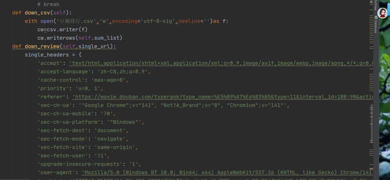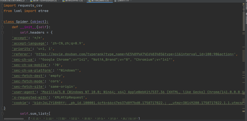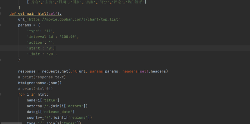 客户要求获取豆瓣电影排名各项分类数据信息,包含'片名','主演','日期','国家','类型','评分','评论','热门短评',利用开发工具中的类方法对数据进行整体提取,并对支线环节分开执行,在主线中调用。
