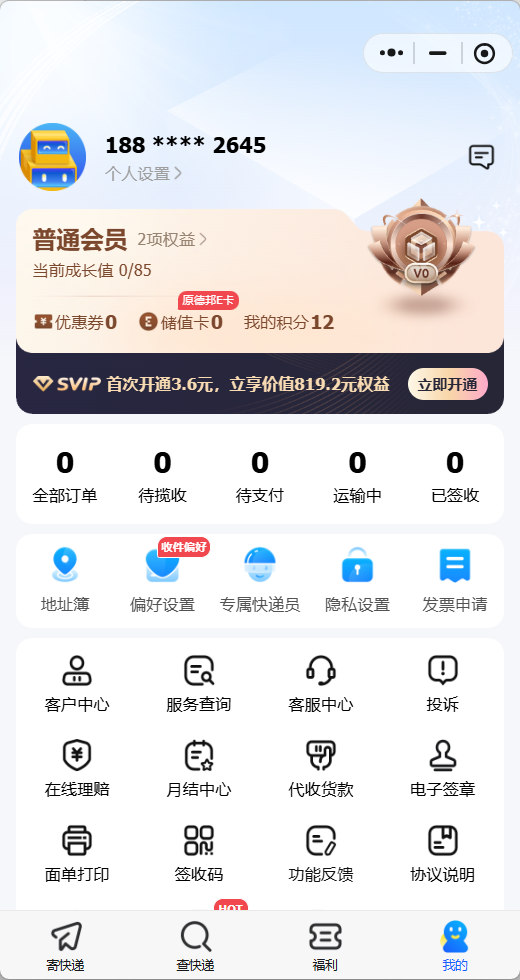 功能模块:核心包含首页智能寄件、地址簿管理、运费试算、订单全生命周期管理、物流轨迹实时追踪、在线支付与账单管理、优惠券与会员体系、网点查询与预约、售后理赔、客服中心十大模块,配套小程序授权、消息推送、异常提醒等基础功能。