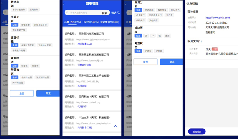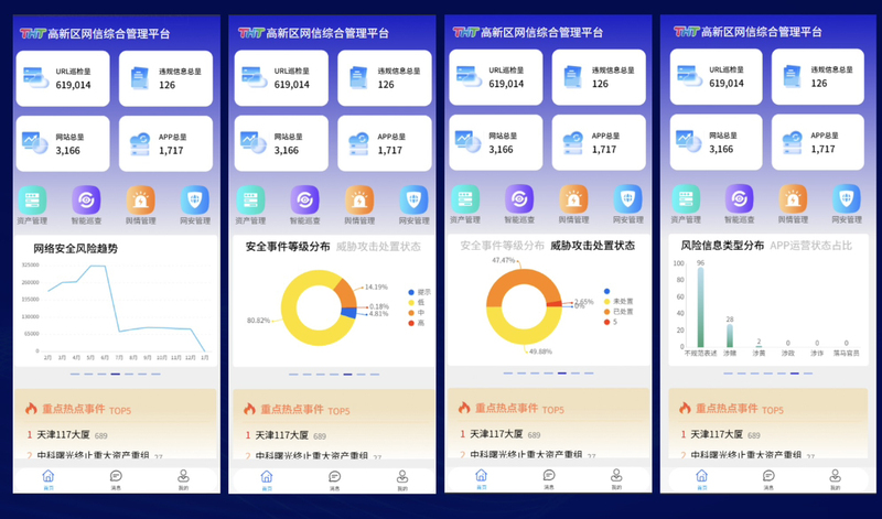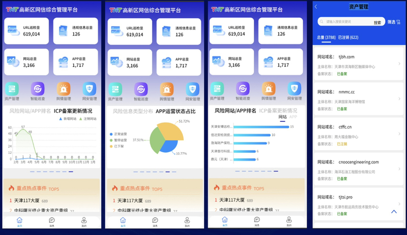 本项目面向高新区网信管理场景,聚焦区域内网站、APP等数字资产的全生命周期监管,通过智能巡查、舆情监测、网安事件处置等能力,实现对涉黄、涉赌、涉政等违规信息的精准识别与闭环处理,助力网信部门高效管控网络安全风险,维护清朗网络空间。