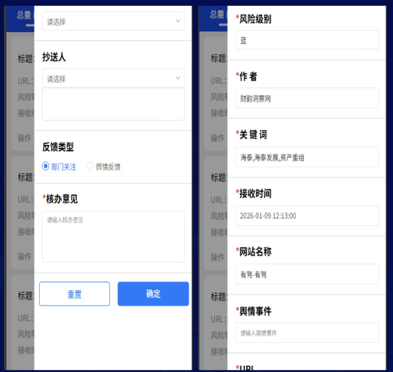 • 后端接口与逻辑:设计并实现了与市办下发台、巡网台等外部数据源的对接接口,开发了违规信息识别、风险等级评估、事件处置流程等核心业务逻辑。