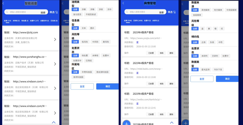 • 智能巡查:自动巡检URL,识别违规信息类型(如涉黄、不规范表述),并按风险等级分级预警。