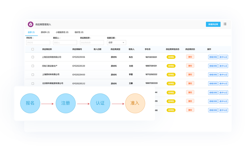 1.供应商管理模块,包含供应商档案,供应商在线注册、资料提交